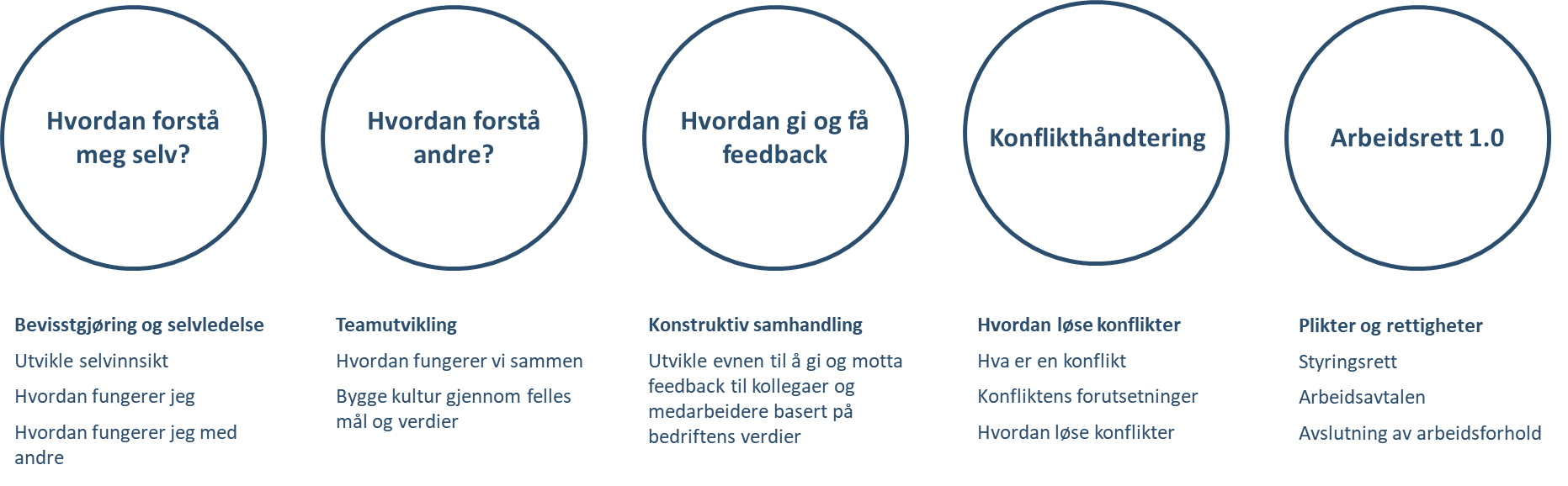 Vi lager et skreddersydd program som sikrer medarbeidernes forståelse av sin rolle som arbeidstaker. Vi tilbyr disse modulene enkeltvis eller samlet: